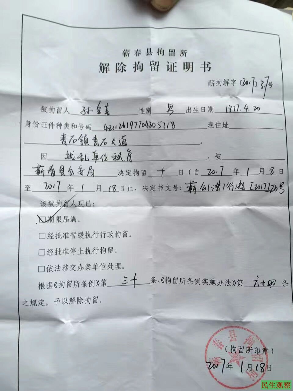 据悉,今年1月6日,孙德胜被国保警察从广州带回蕲春,软禁在当地一家宾馆内。得知弟弟已返乡但多日未到家,孙金喜于1月8日上午到漕河派出所询问,但对方拒不说明超期羁押孙德胜的理由。