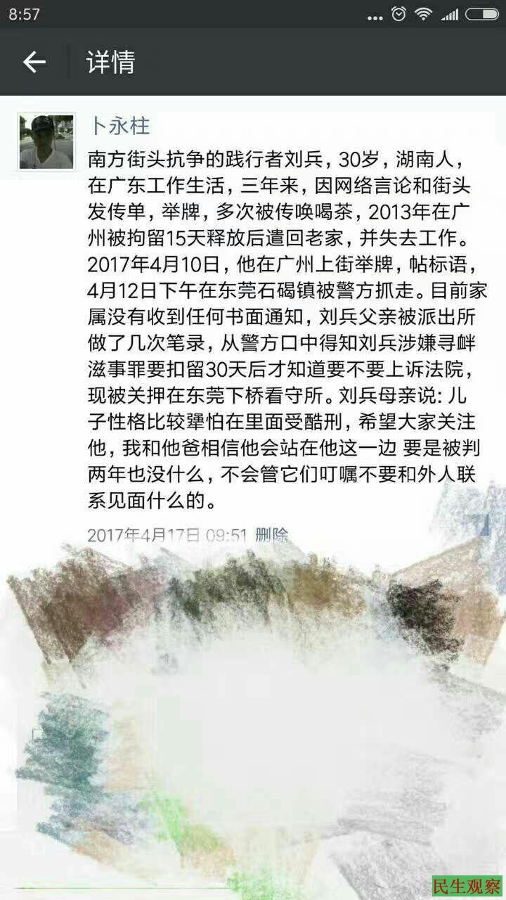 【民生观察工作室2017年4月20日东莞消息】本网获悉,身在东莞工作的卜永柱(@南街柱子)因为转发有关刘兵被刑拘的消息半夜被传唤。