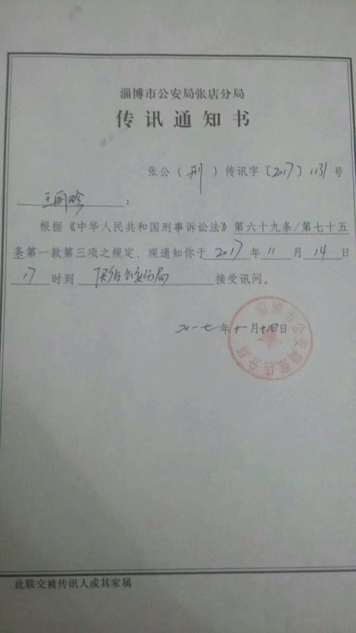 【民生观察2017年11月14日消息】本网获悉,山东淄博市拆迁受害者王丽珍因为在网上曝光“淄博开发区强拆事件”,今天下午被潍坊张店区警方传唤。