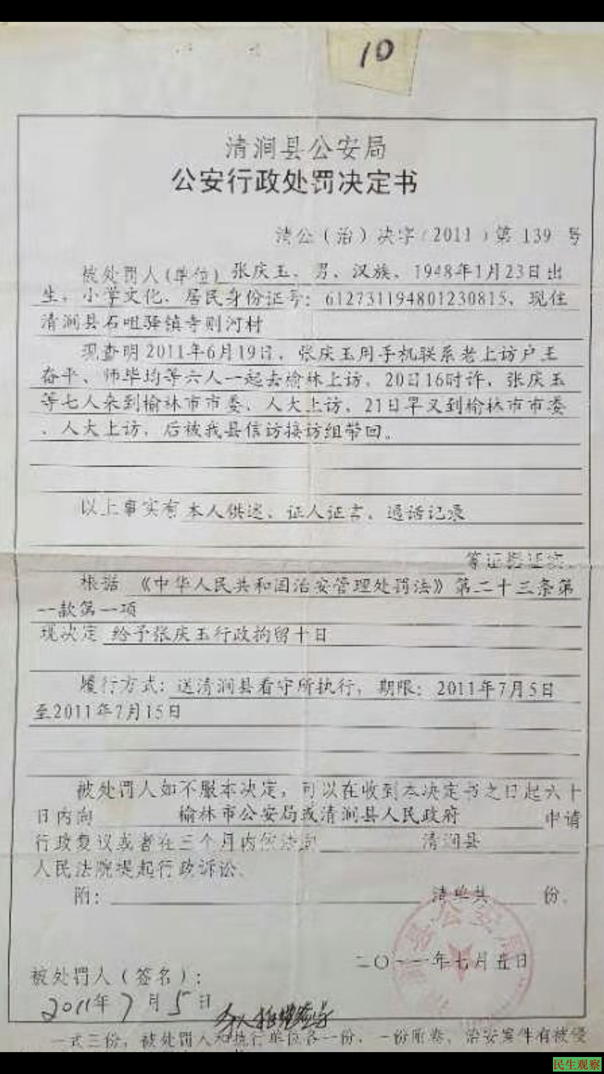 【民生观察2019年10月23日消息】2001年,陕西省榆林市清涧县石咀驿镇寺泽河村村民张庆玉,150间简易房等财产被村长带头盗抢,之后又以村委会名义变卖。张庆玉依法维权18年不成,反遭拘留。