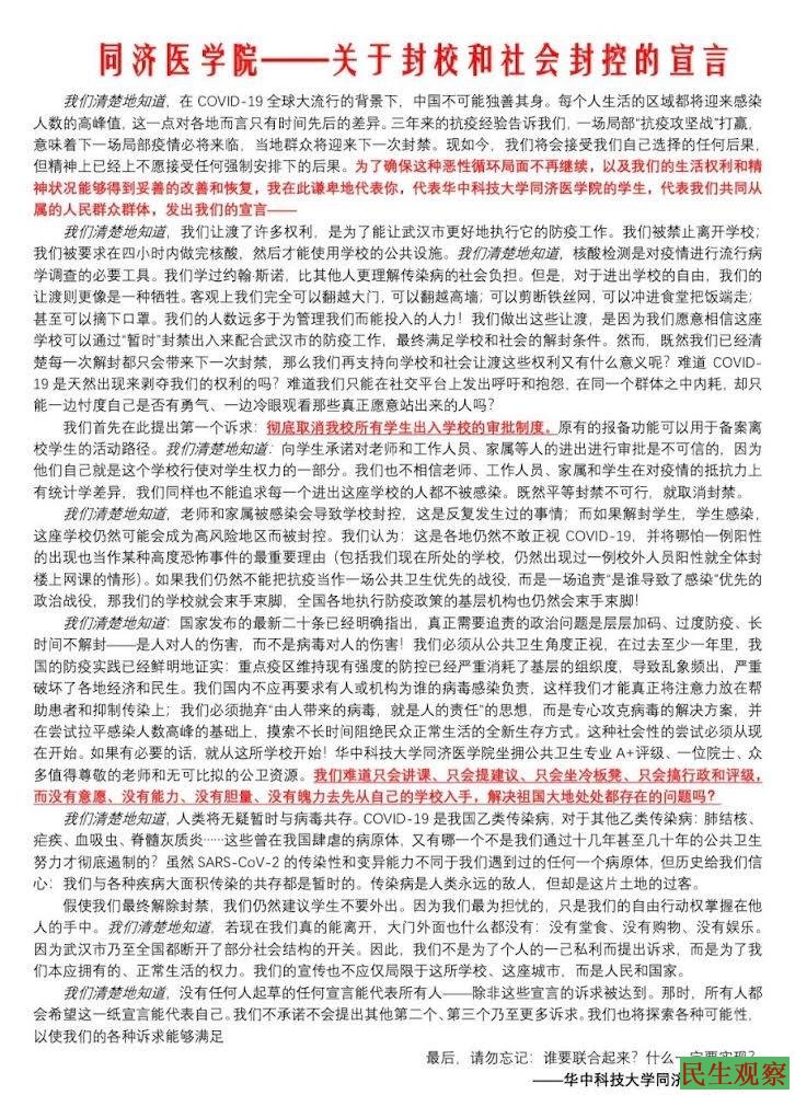 武汉华中科技大学同济医学院学生发表《关于封校和社会封控的宣言》。