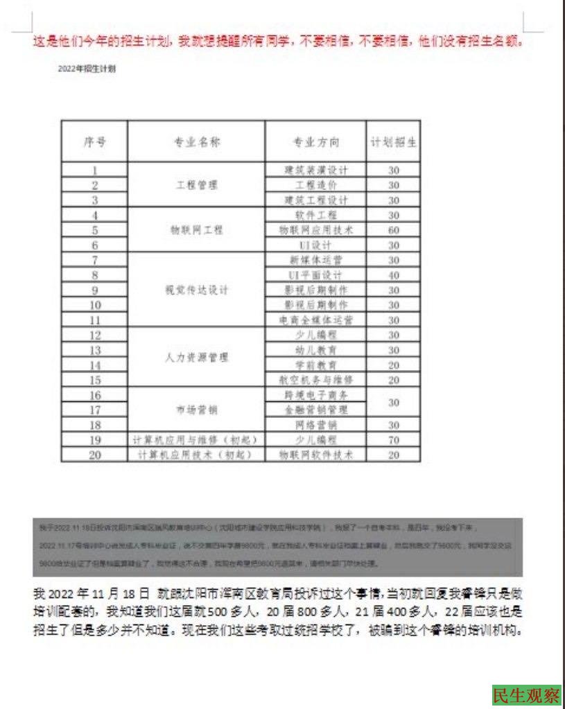 【民生观察2023年3月29日消息】沈阳城市建设学院应用科技学院存在夸大宣传虚假招生问题。据悉,当初招生时宣传是全日制的大专学历,然而实际上是全日制教学的成人学籍。导致现在学生四年学习之后学信网没有学籍,交了四年的学费,什么学历都没有。学生们前往当地教育部门投诉,但是没有得到任何回应。在抖音上发消息,被威胁删除。
