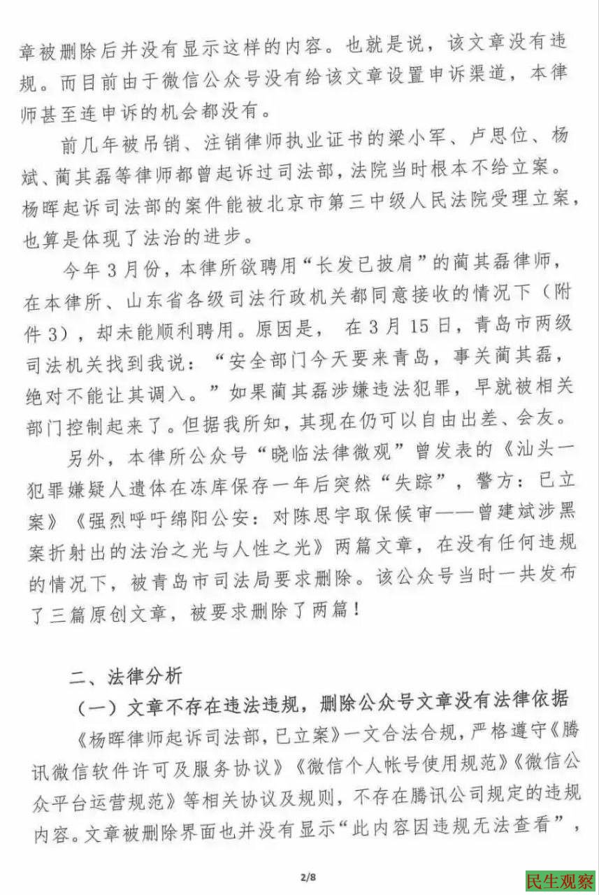 【民生观察2023年7月11日消息】2023年7月9日,山东青岛的于凯律师,因文章被青岛司法局和律协联合腾讯公司删掉,现发律师函给司法局和律协,要求恢复该公众号文章,保障自己的言论自由。
