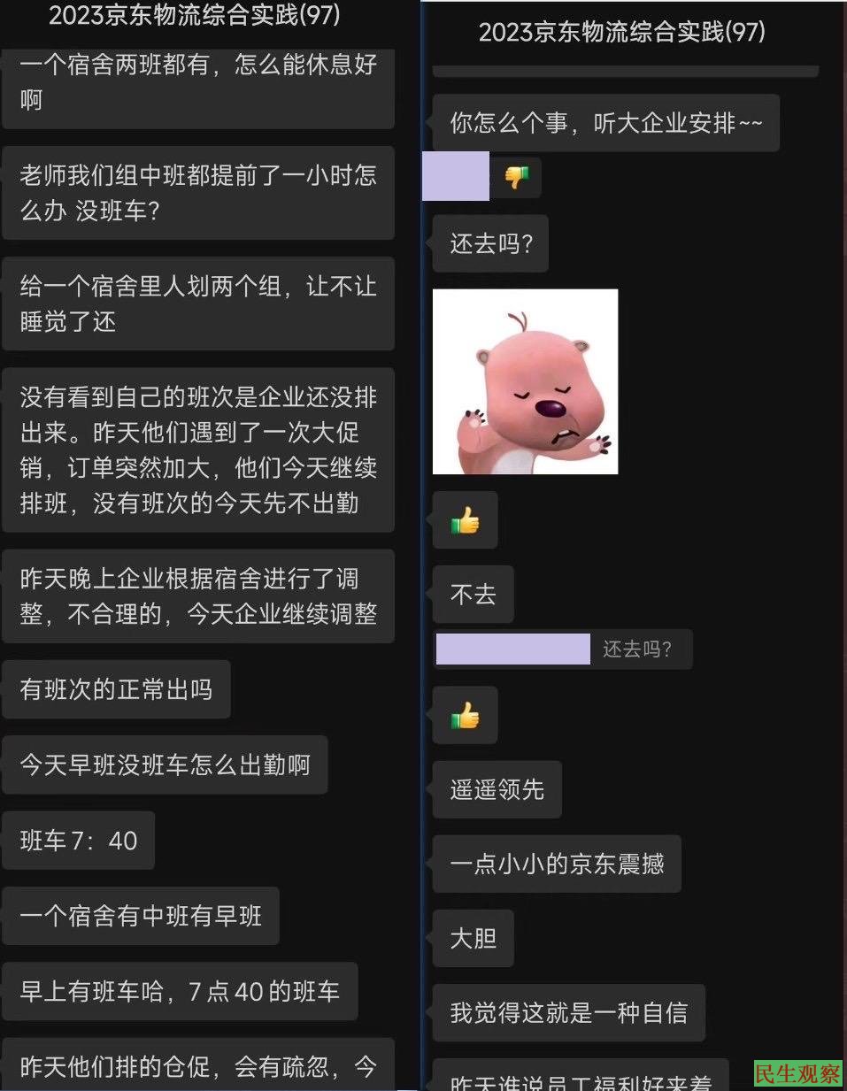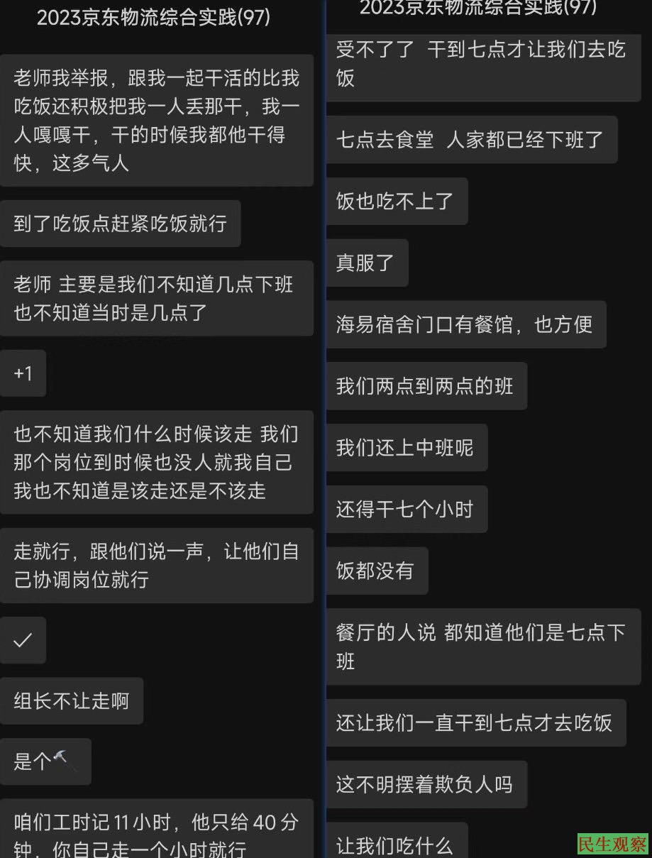 【民生观察2023年11月8日消息】山东农业工程学院,在双11活动前夕将把学生送到京东物流仓库“实践”,实为卖猪仔干苦力,学生每天工作12小时,实际工资260,却只给学生140,剩余都被学校克扣。学生不满学校的安排和企业的压榨,合理表达意见,被学校指责带节奏传递负能量,但最终学生们的抗议获得了胜利,京东和学校中止了本次实践。