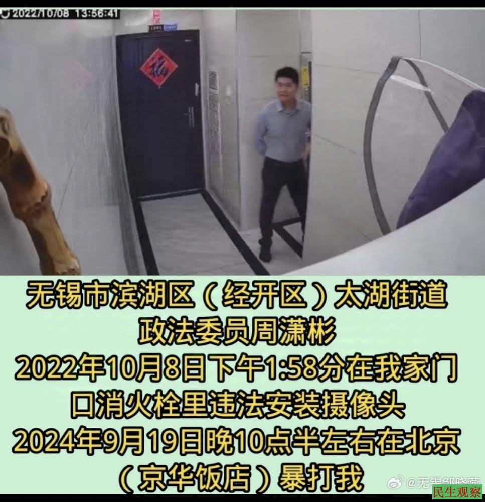 2024年9月19日晚10点30分左右,邹晓燕遭到地方截访,在北京驻京办事处(京华饭店)一楼最后一个房间内,被无锡经开区太湖街道政法委员周潇彬,殴打十几巴掌,一拳头打在左腮邦上,直到把邹晓燕打的头晕目眩呕吐不止。