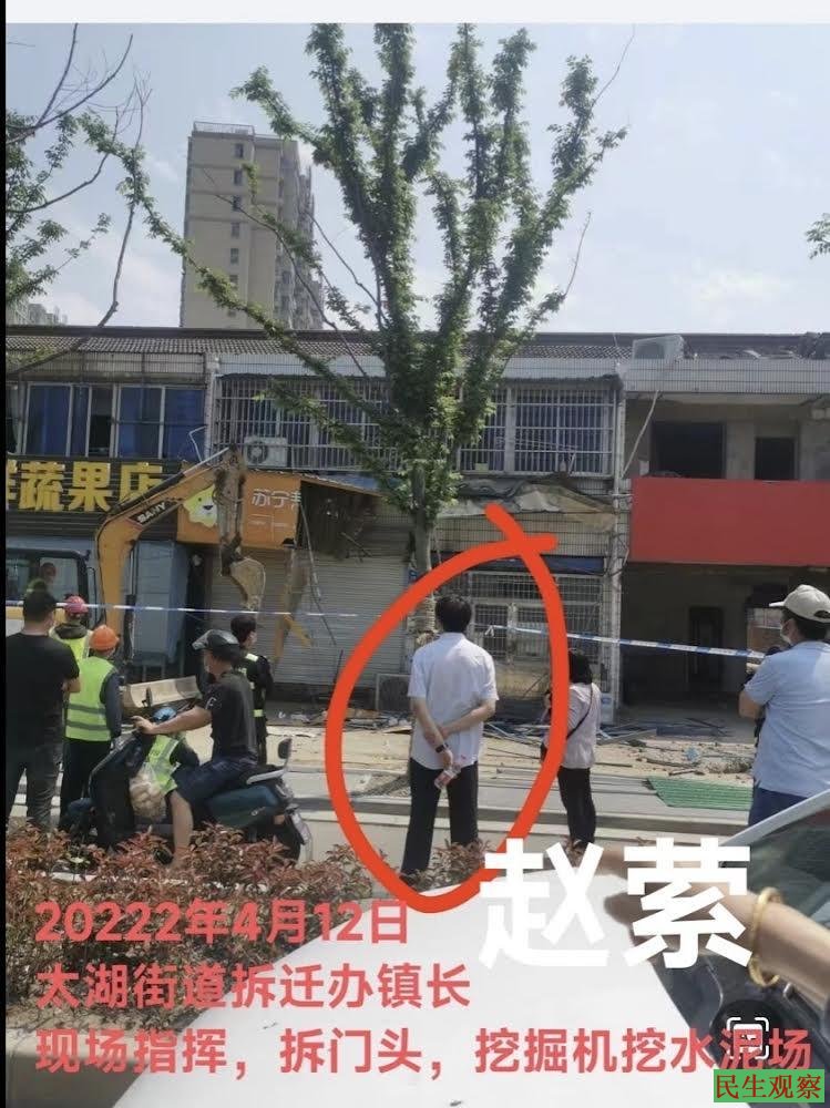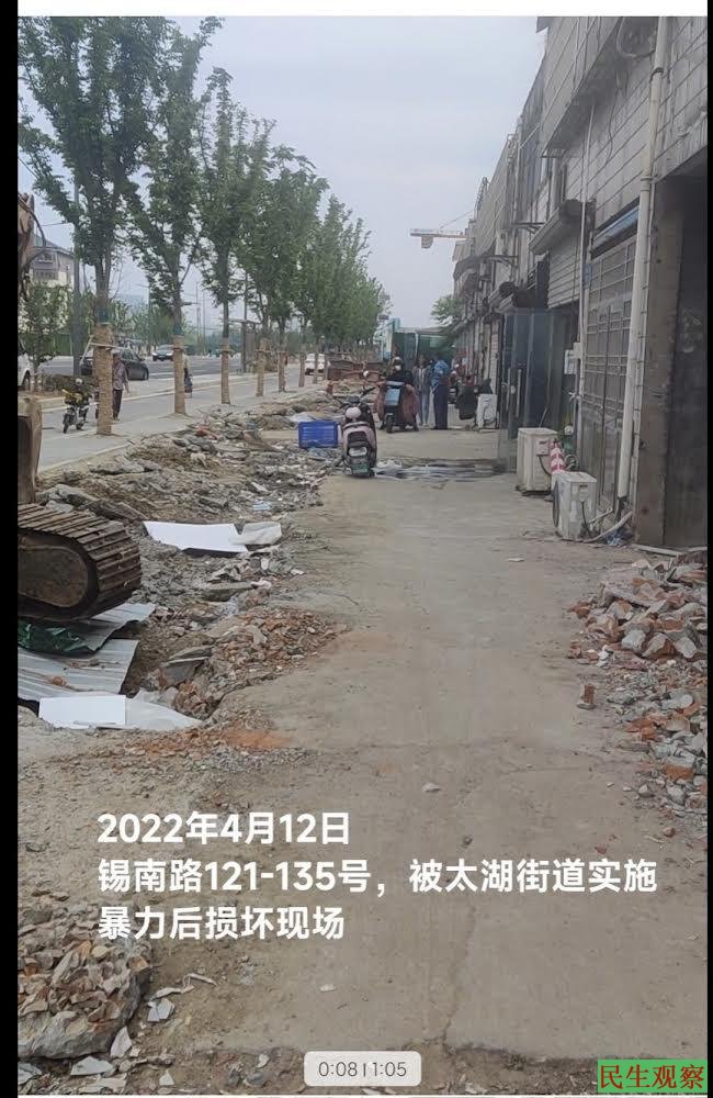 2022年4月12日,邹晓燕的店面被无锡市滨湖区太湖街道办事处损毁。为了达到逼迁之目的,负责拆迁的街道办主任带领几十人砸掉邹晓燕店面灯箱招牌,毁掉店门口水泥地,进出处安装围挡阻止行人车辆通行。