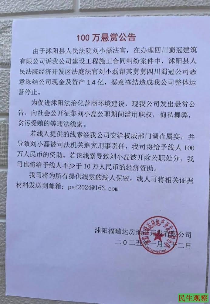 2025年1月22日,沭阳福瑞达房地产开发有限公司(以下简称福瑞达公司)发布悬赏公告称,由于沭阳县人民法院刘小磊法官,在办理四川蜀冠建筑有限公司(以下简称蜀冠公司)诉沭阳福瑞达房地产开发有限公司建设工程施工合同纠纷案件中,沭阳县人民法院经济开发区法庭法官刘小磊枉法办案,帮其舅舅四川蜀冠公司恶意冻结福瑞达公司现金及资产1.4亿,恶意冻结造成该公司整体运营停止,其行为同时严重违反了国家公职人员的行为规范。