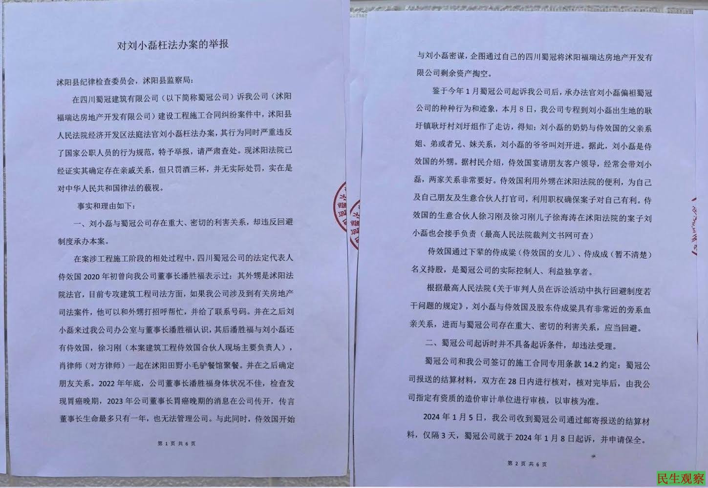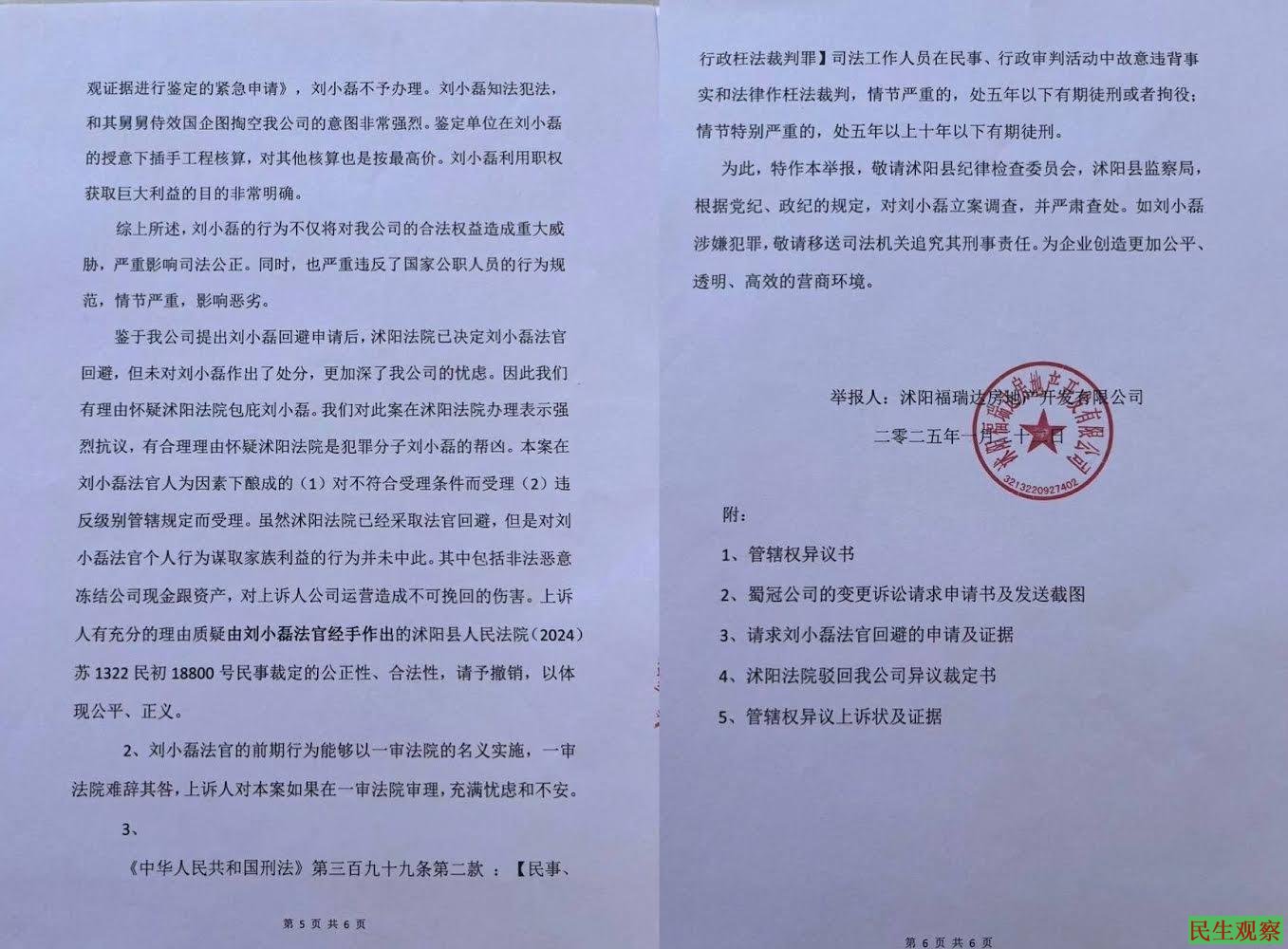 与此同时,沭阳福瑞达房地产开发有限公司于同日就该案,向沭阳县纪律检查委员会,沐阳县监察局,举报法官刘小磊枉法办案。现沫阳法院已经证实其确定存在亲戚关系,但只罚酒三杯,并无实际处罚,实在是对中华人民共和国律法的藐视。,
