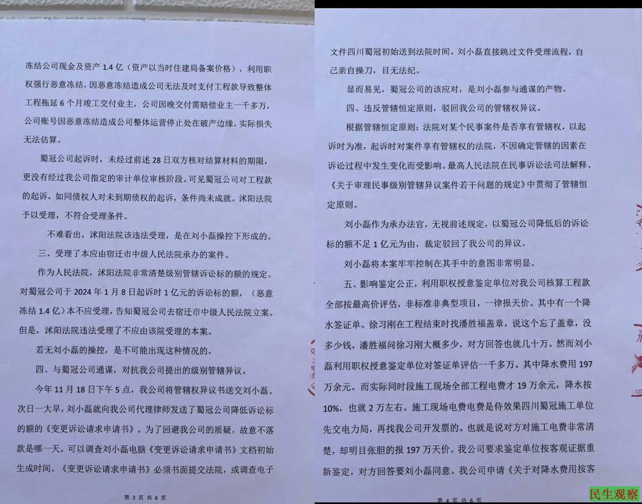 【民生观察2025年1月29日消息】2025年1月23日,江苏沭阳县。网曝沭阳县法院法官刘小磊,亲自办理舅舅的案件,将被告公司的现金及资产1.4亿元冻结。于是被告公司张贴悬赏公告,公开征集法官刘小磊在职期间滥用职权、徇私舞弊、贪污受贿等违法线索。与此同时,被告公司书面举报沭阳县法院法官刘小磊枉法办案。