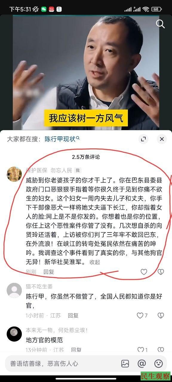 陈行甲一直以反腐代言人自居,你披着这个外衣,不仅赢得了掌声,赢得了不了解你真实的群众的支持,还赢得了荣誉与名声,赢得了财富地位。从你对待我的事情来看,你做的这一切都是伪造的,是刻意修饰的,在你伪装的后面,是跟许多腐败分子一样的丑陋,一样的虚伪,一样的不得人心,你这样的伪装,不仅危害社会,而且危害国家的政治与经济,你的这些伪装,比那些腐败分子更彻底,更全面,你愚弄群众更阴险,更狡诈,比那些腐败分子更可怕,更危险。正象新华社记者吴淮军先生质疑的那样,陈行甲先生:“你任上这个恶性案件你管了没有?几次想自杀的向贤玲还活着,上访被你们判了三年牢不敢回巴东,在外流浪!在峡江的转弯处的冤民依然在痛苦的呻吟。我调查这个事件看到了真实的你,你与其他狗官无异。”