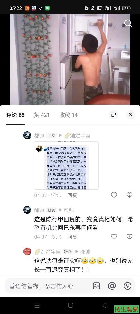 当我在网上曝光真相后,得到许多正直的、有良心、有担当的网民的同情与支持,有的网友多方面在网上对你提出了质疑,希望你能说出当年单江山猝死的真相,说出单大贝被谋杀的真相;你却在网上颠倒黑白,昧着良心说假话,你说:“孩子有精神问题,六名同学在宿舍里,他突然说看见什么恐怖的东西,从宿舍跳下楼摔坏了。”又说:“他们一直要学校赔三百万。她老公是因为孩子没有了,自己跳江的。”(有陈行甲在抖音的留言为证。)