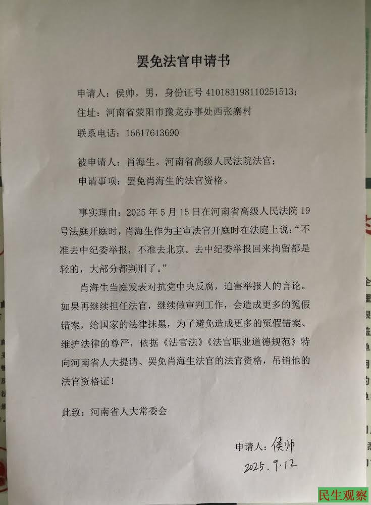 【民生观察2025年9月14日消息】近日,河南省荥阳市豫龙办事处西张寨村村民代表侯帅,向河南省人大常委会递交申请书,要求罢免河南省高级人民法院法官肖海生的法官资格,原因是其当庭发表对抗党中央反腐,迫害举报人的言论。