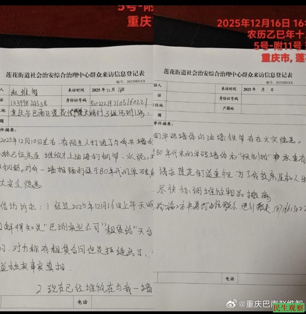 2025年12月16日,赵维智向重庆市巴南区莲花街道社会治安综合治理中心提交信访材料,经街道及村委协调,明确要求被反映单位立即搬离整改。