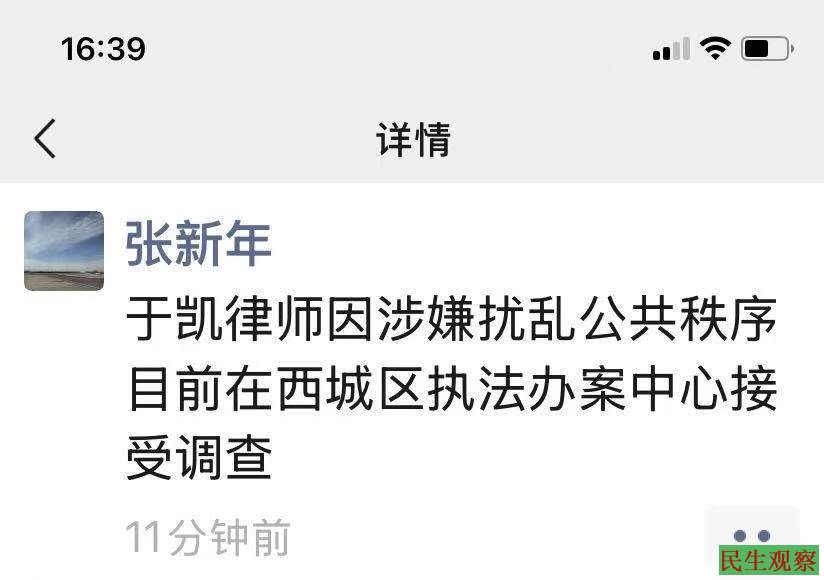 此前有两位律师要递交代理于凯律师的委托手续,被西城公安分局警察,以“案件征办中不接手续”为由,违法拒绝辩护律师的介入。
