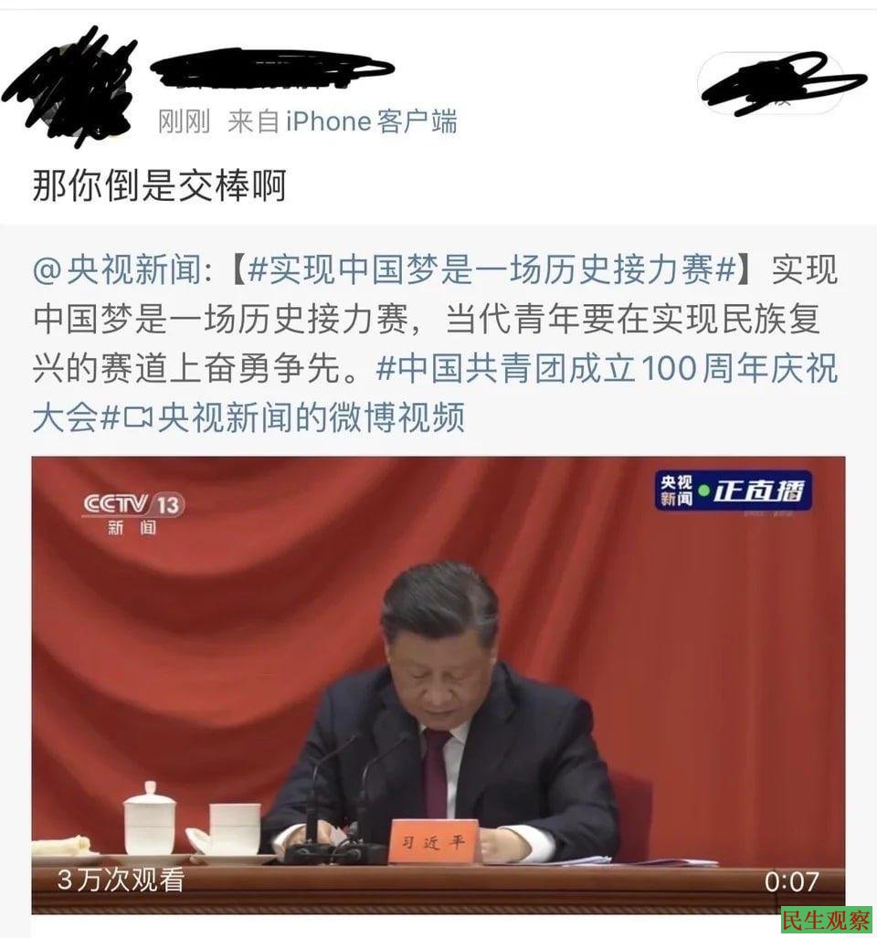5月10日,习近平在庆祝中国共产主义青年团成立100周年大会发表讲话,他提到“实现中国梦是一场历史接力赛,当代青年要在实现民族复兴的赛道上奋勇争先”。然而就在几天前,微博大V“马特特别胖”在微博转发了央视新闻微博所发的这一金句摘录,并写道“那你倒是交棒啊”,这句“辱包”言论引起了网民的围观与致敬,“马特特别胖”的新浪微博帐号目前已被当局查封,微博上再无法搜到相关帐号。而在央视新闻的原发微博上无法看到“最新评论”,而点击“转发评论”,仍能看到个别网友的调侃“下一棒”、“赶紧交”、“特地来看转发”。