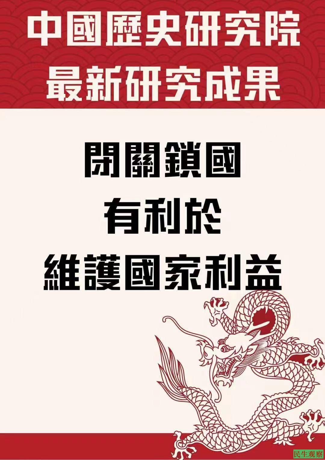 作者郁风在其微信公众号“我就是郁风”发表文章《批驳历史研究院“闭国锁国有利论”》,文章说,历史研究院为写进历史教科书多年的“闭关锁国论”翻案,将其说成正面的“自主限关”。但到底是“闭关”还是“限关”,其目的究竟是维护国家安全,还是维护爱新觉罗一家的统治,“稍有常识的人都能分辨出来”。