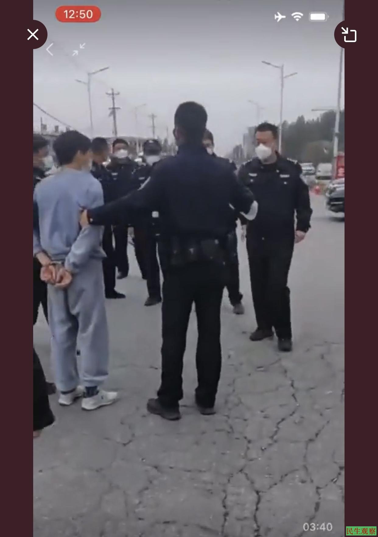 文章中描述:十几个特警等待在封控口,又用镣铐锁着他,又命令他将口罩戴好,又用消毒液将他面部和全身喷洒,众人浩浩荡荡离开封控口,这真是震撼人心的逮捕。