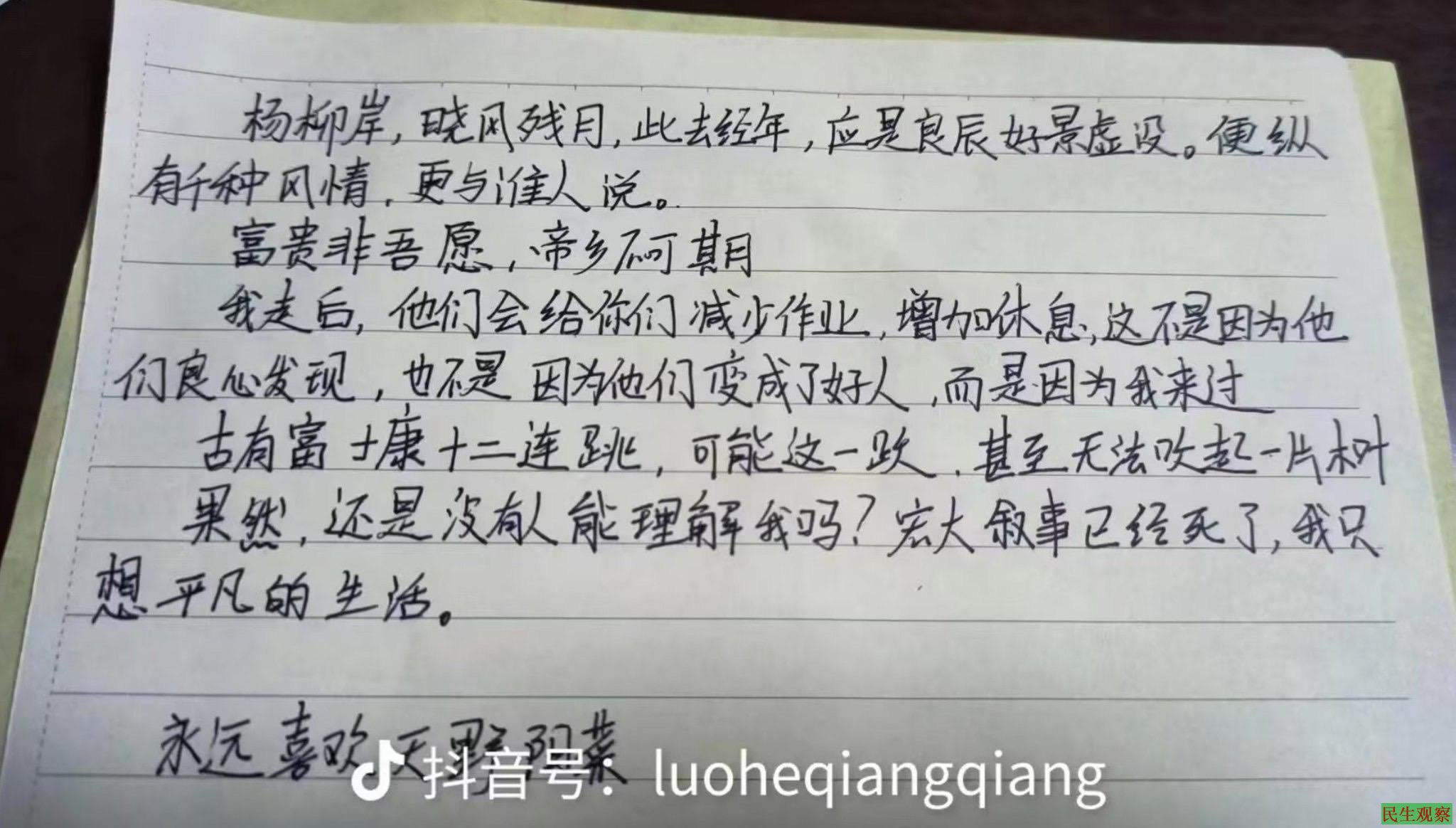 对此,网友“野百合小乐生活记”发文称,“孩子的这封遗书让人非常扎心!通篇看下来,孩子是非常爱自己父母亲的,文中出现了两次叫父母亲不要自责的话,还出现了一次让父母亲继续好好生活下去的话。