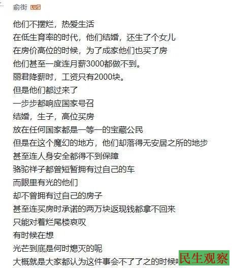 “亮亮丽君”无法发声更加激起了网民的愤怒与无奈。一些网民调侃,称禁言是因为他们的故事太缺乏正能量了。在知乎上,一条评论写道:“原来现在的我们和历史中的人民没什么区别。所有历史,都是当代史。”网民感叹,这起孤立事件是中国房地产的缩影,可以看到普通人买到烂尾楼有多绝望。“这是我们国家最普通又最有代表性的小夫妻,家庭掏空钱包,北上未来几十年人生,换来一套烂尾楼。”有网民说:“时代的一粒沙,落在普通人身上就是一座山!”有人说:“感同身受,不过我的亏交房了,当时停工两个月我心脏都快停了。”有人说:“难怪年轻人都要躺平,不是不努力,而是没有努力的理由。”也有人说,“这是我们国家最普通又最有代表性的小夫妻,家庭掏空钱包,北上未来几十年人生,换来一套烂尾楼。”也有人表示:“我们韭菜啥也别碰了,就努力加班不饿死就行。”