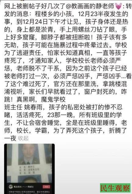 该知情者全文帖文如下:网上被删帖子好几次了@教画画的静老师:转发的消息:程楼乡的小孩,12月23半夜发生的事,到12月24日下午才让见,孩子身体还是热的,身上都是淤青,手上用螺丝刀钻了眼,手上好多窟窿,脚脖子都被扭断啦!孩子该有多无助,孩子可能在施暴过程中疼晕过去。