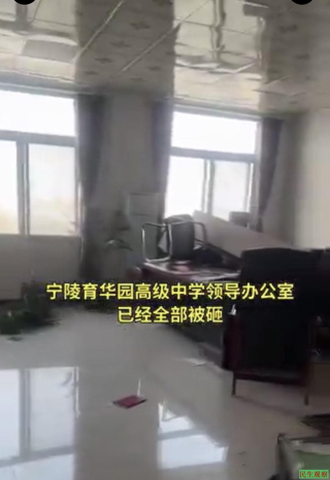 据网友拍摄的一段视频显示,宁陵育华园高中的领导办公室已经悉数被砸,桌子椅子柜子东倒西歪。