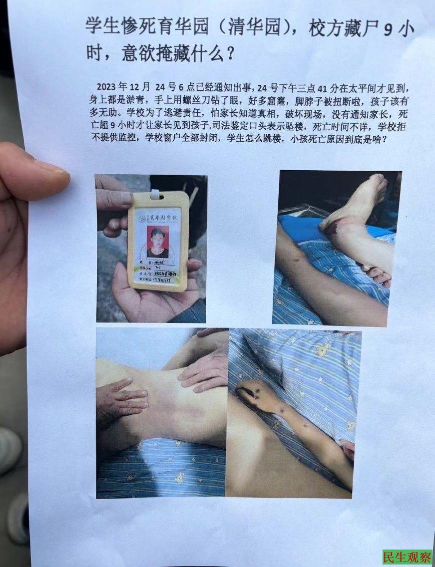 死者家属在一份现场流传的传单上称,12月24日早上6点,学校通知他们,说死者在学校出事,但家属直到当天下午3点41分才见到遗体。他们发现死者身体有多处伤痕,手部被人用螺丝刀钻了眼,有很多窟窿,脚脖子被扭断。他们怀疑,学校在拖延时间掩盖真相。他们要求学校提供监控视频和相关证据,但学校拒绝了他们的要求。