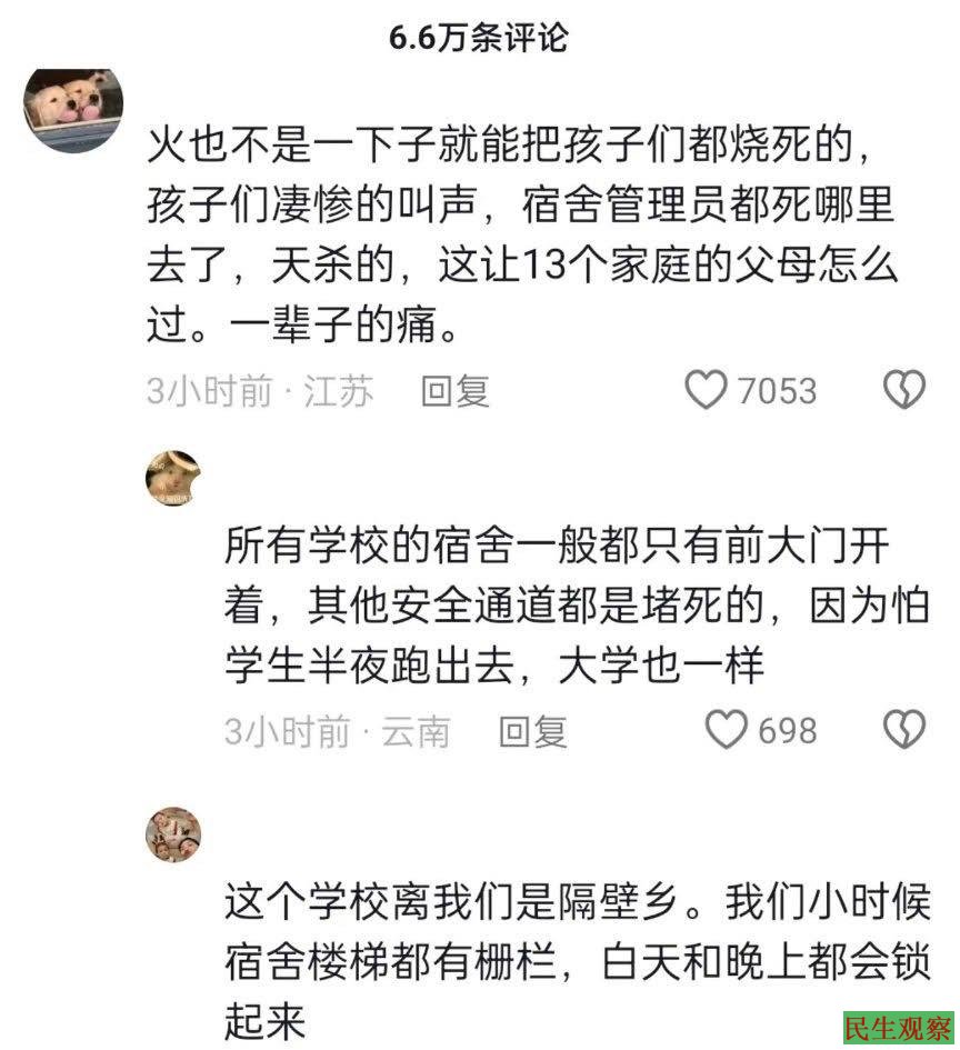 网友A:火也不是一下子就能把孩子们都烧死的,孩子们凄惨的叫声,宿舍管理员都死哪里去了,天杀的,这让13个家庭的父母怎么过。一辈子的痛。