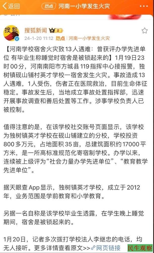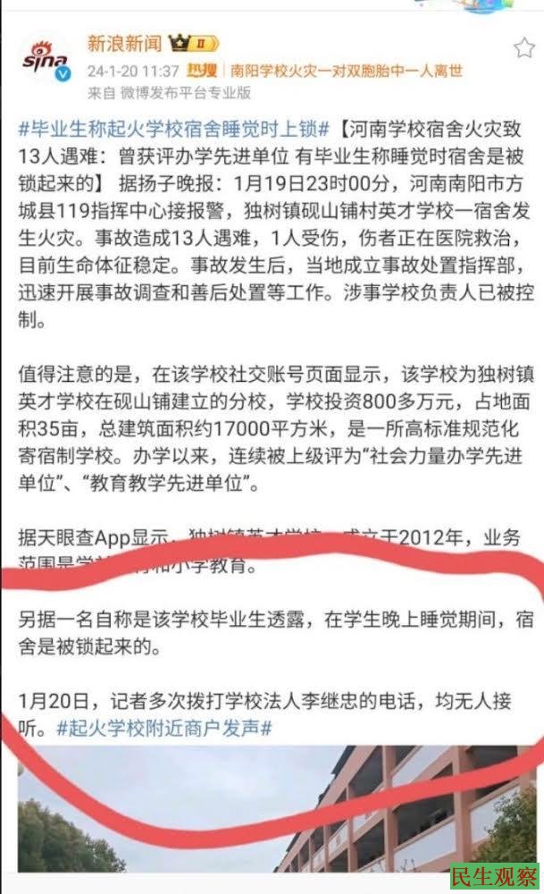【民生观察2024年1月22日消息】近日,河南南阳方城一学校宿舍发生火灾,致13人遇难,1人受伤,目前伤者正在救治中。据称,事发是一间小学三年级的男生宿舍,孩子们在睡觉时宿舍门是被锁起来的,家属至今还未见到孩子的遗体,还在等待DNA鉴定,警方带多人上门对家属进行“慰问”。这一重大事件引发众多网友的关注和讨论。
