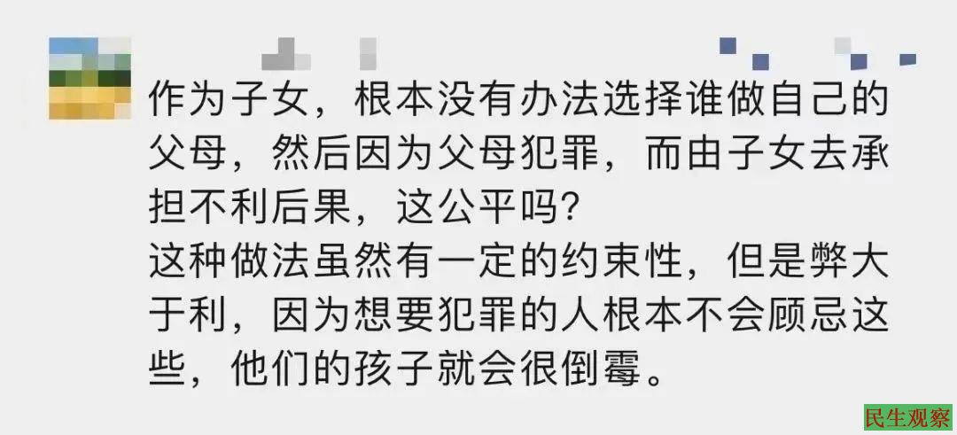另据报道,2023年两会前夕,全国政协委员周世虹接受采访时表示,一人犯罪受到刑事处罚,就影响其子女、亲属参军、考公、进入重要岗位的规定,应予以彻底摒弃,否则会对受影响人员极不公平。该观点一度引发舆论热议。