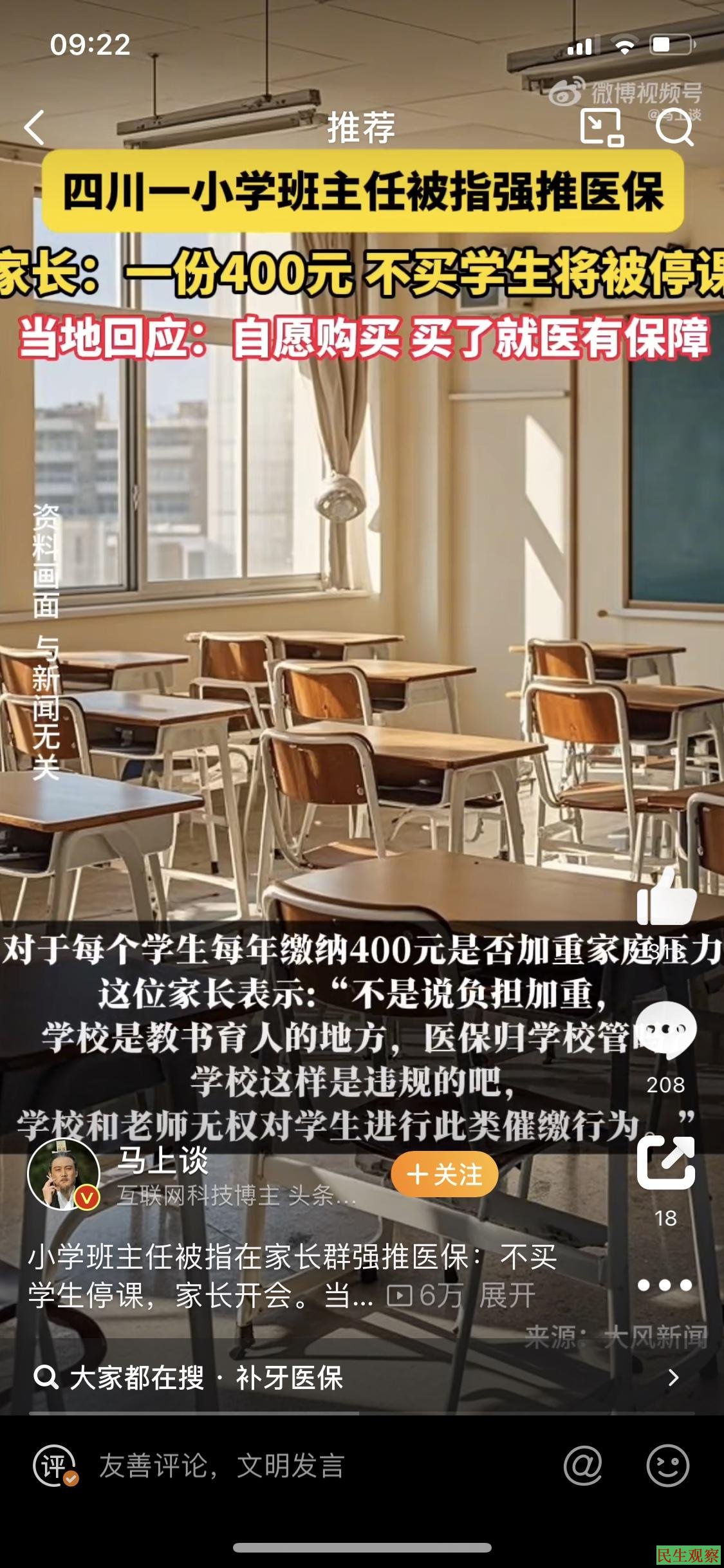 马上谈:小学班主任被指在家长群强推医保:不买学生停课,家长开会。当地回应:自愿购买,买了就医有保障。家长:你不买,天天群里催,小孩都被区别对待了,不买不行啊…锅是当地令学校强推,指不定有百分比任务;班主任也是被派发任务,无奈但是态度是真差…