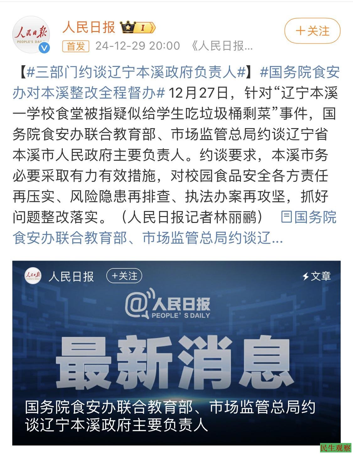 近日,辽宁省本溪市桓仁满族自治县五里甸子镇学校,食堂每天给孩子们吃的饭是从垃圾桶里扒出来的……食堂工作人员发现菜不够了,直接把准备喂狗的垃圾桶剩菜倒出来,给学生们二次食用,甚至有学生在吃饭的时候,发现菜里有牙印和饭粒子。多名学生吃后上吐下泻,12月27日,国务院食安办联合教育部、市场监管总局约谈辽宁省本溪市人民政府主要负责人,只约谈是很难让学生家长满意的,也是很难让舆论和公众满意的。