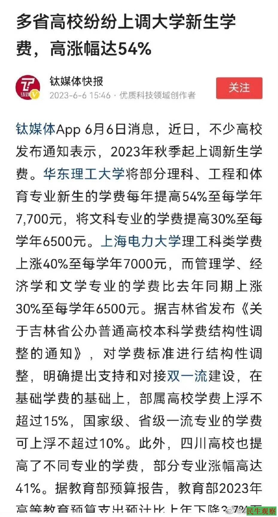 壹点文字:今年以来,高校迎来又一波“涨价”,包括上海、吉林、四川等多省高校纷纷上调大学新生学费。有学者指出,高校学费怎样涨,应对底层人民的承受力有所判断,对高校的支出有准确审计,不能成为一笔糊涂账。有人担心,学费的上涨可能会限制一些家庭的孩子接受高等教育的机会,从而削弱了社会公平性和机会均等。对于部分学生来说,这一调整也意味着他们需要更多地思考如何应对学费上涨的压力。高校学费上涨关乎教育公平正义,更关乎弱势群体向上流动的机会,不能让一个大学生因学费而失去学习的机会。