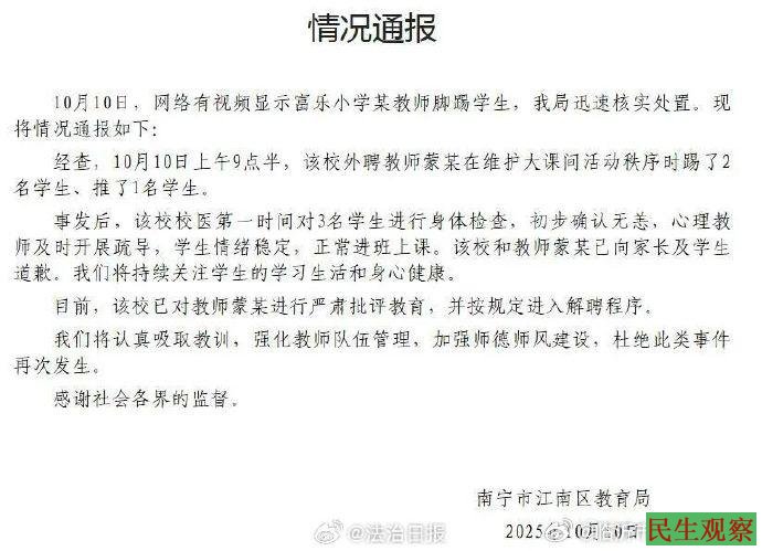 10日晚,南宁市江南区教育局发布通报:经查,10月10日上午9点半,该校外聘教师蒙某在维护大课间活动秩序时踢了2名学生、推了1名学生。事发后,该校校医第一时间对3名学生进行身体检查,初步确认无恙,心理教师及时开展疏导,学生情绪稳定,正常进班上课。该校和教师蒙某已向家长及学生道歉。将持续关注学生的学习生活和身心健康。目前,该校已对教师蒙某进行严肃批评教育,并按规定进入解聘程序。