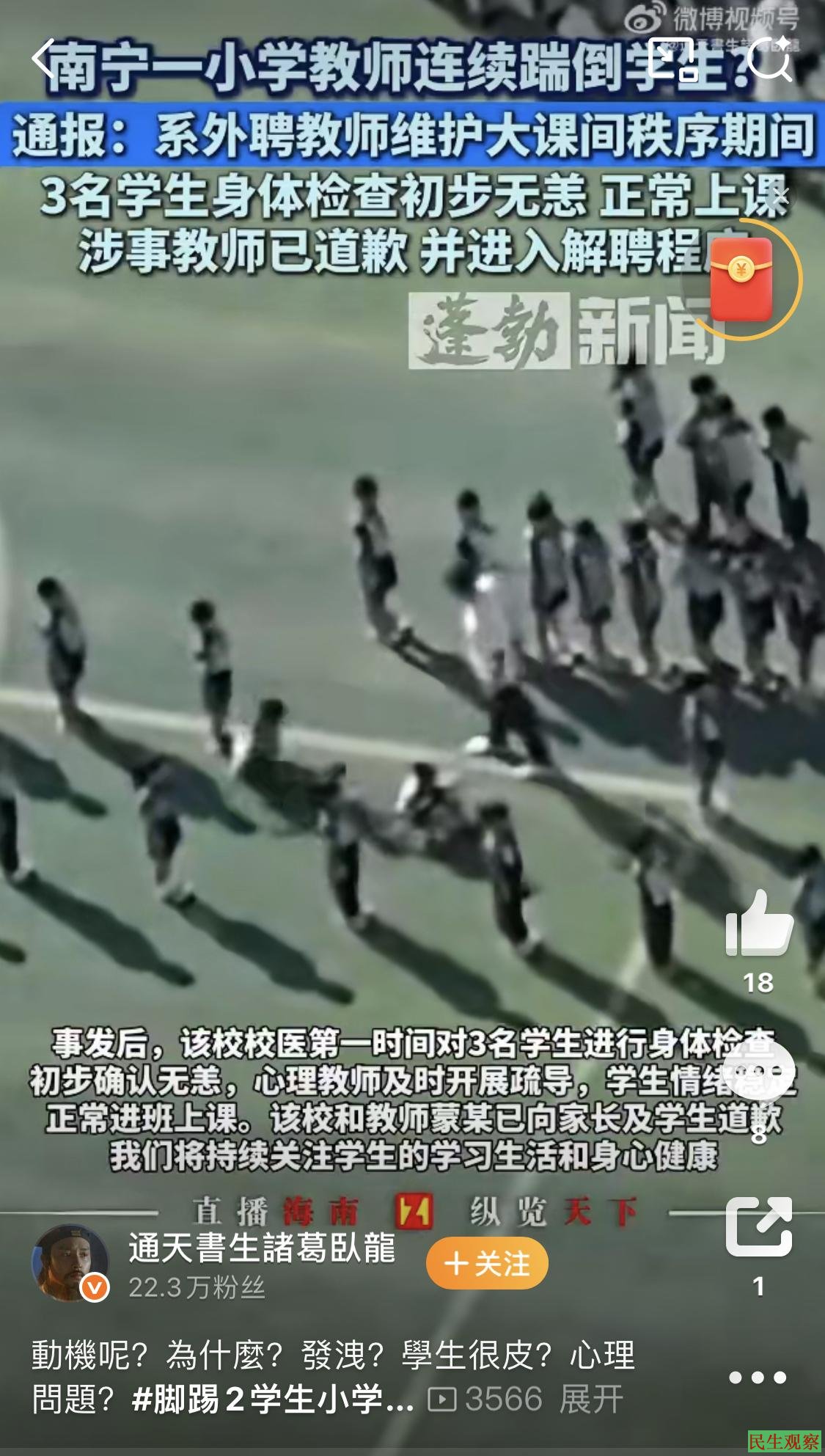 昼眠月:广西南宁一小学操场上,一名老师对学生实施脚踹行为,两名学生被踹倒在地后迅速起身站回原位。另有拍摄者表示,被踹学生或不低于10人,不分男女。体罚零容忍,师德是底线,教师脚踹学生的行为,不仅违背《未成年人保护法》《教师法》中“不得体罚学生”的明确规定,更突破了师德师风的基本底线。学生的身体与人格尊严受法律严格保护,即便存在管教需求,也必须采用文明、合规的方式。涉事老师脚踹学生的行为,不仅是对学生身体与尊严的双重伤害,更是对教师职业伦理的严重践踏,必须依法依规严肃处理,绝不能姑息。