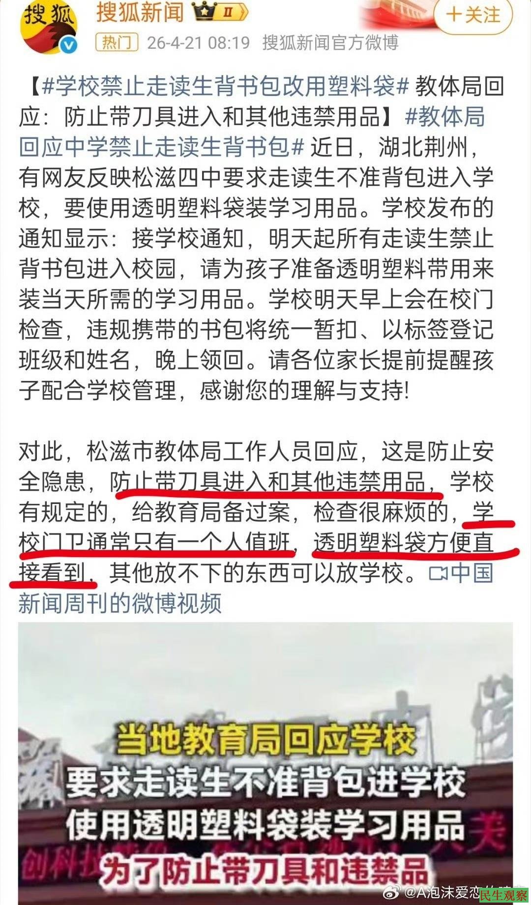 说到底就是学校图省事懒政,把管理成本全转嫁给学生,一点都不考虑实用性,把学生当贼防,连基本的隐私和尊严都不顾了。好在教育局叫停整改道歉了,用透明书包、配安检设备不比塑料袋靠谱?安全管理不能一刀切,更不能牺牲学生正常学习和身心健康啊!