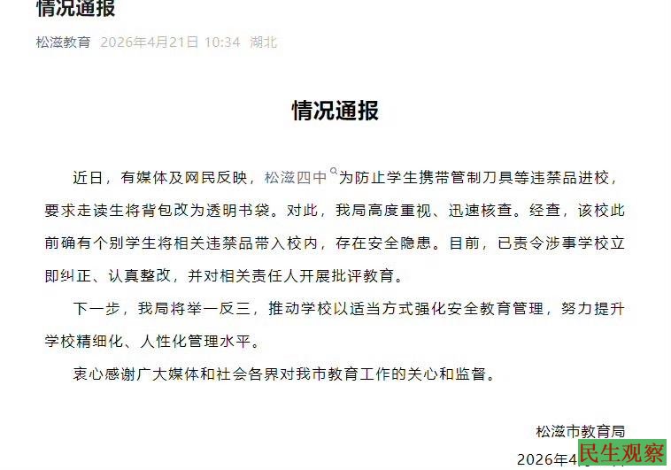 4月21日,松滋市教育局发布情况通报:经查,该校此前确有个别学生将相关违禁品带入校内,存在安全隐患。目前,已责令涉事学校立即纠正、认真整改,并对相关责任人开展批评教育。