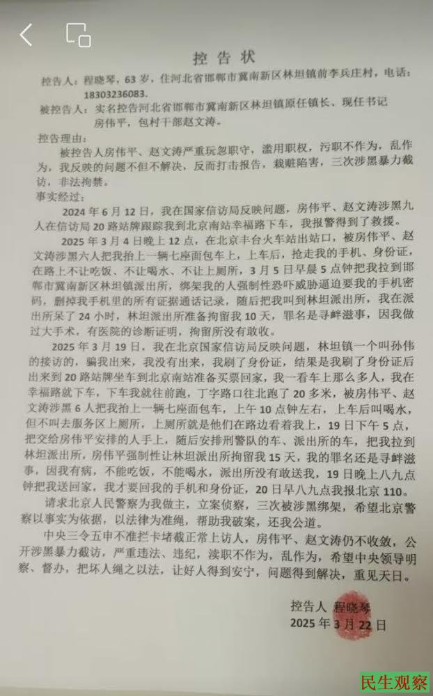 【民生观察2025年3月26日消息】河北省邯郸市冀南新区林坦镇程晓琴,因土地问题进京维权,至今长达10多年一直未解决,反而遭到打击报复、栽赃陷害。2025年3月22日,程晓琴实名控告河北省邯郸市冀南新区林坦镇原任镇长、现任书记房伟平,包村干部赵文涛,滥用职权,玩忽职守不作为,乱作为,对其反映的问题不但不解决,反而多次对程晓琴涉黑暴力截访,非法拘禁。