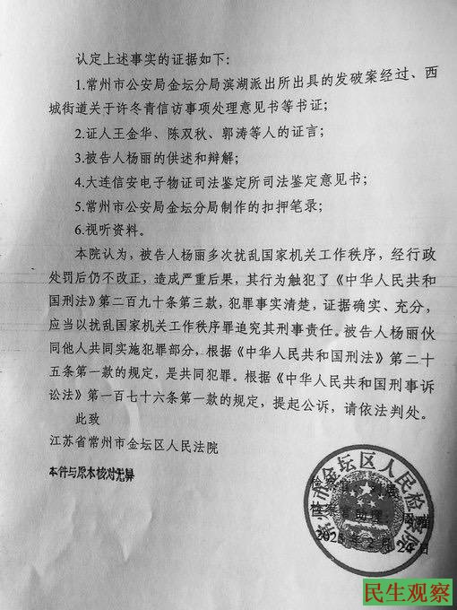 3月28日,许冬青的大女儿杨彩英透露,江苏常州市金坛区人民检察院第一检察部主任刘展,为迫害其肾病4期的妹妹杨丽撰写的起诉书已面世。
