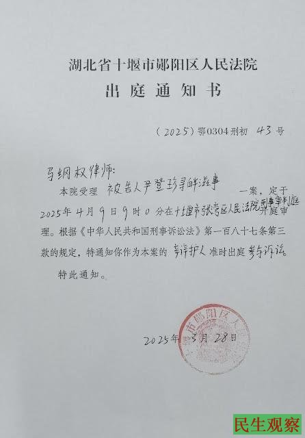 【民生观察2025年4月7日消息】湖北十堰公民尹登珍涉嫌寻衅滋事罪一案,将于2025年4月9日早上9点,在湖北省十堰市张湾区人民法院(地址:茅箭区邮电街12号)开庭审理,欲参加庭审旁听的朋友们请加盛兰福微信,家属感谢各位网友的帮助和支持。