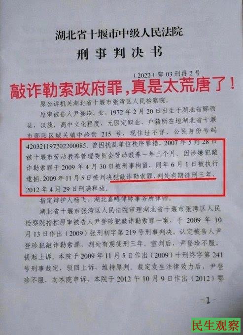 后因民事官司执行不到位,2006年尹登珍开始上访维权,2007年被劳教1年3个月,2009年被市政府、公检法集体做假证捏造冤案“敲诈勒索政府罪”判刑服刑3年,该案通过尹登珍上诉申诉16次,最终于2022年5月30日其“敲诈勒索政府罪”被宣告无罪。