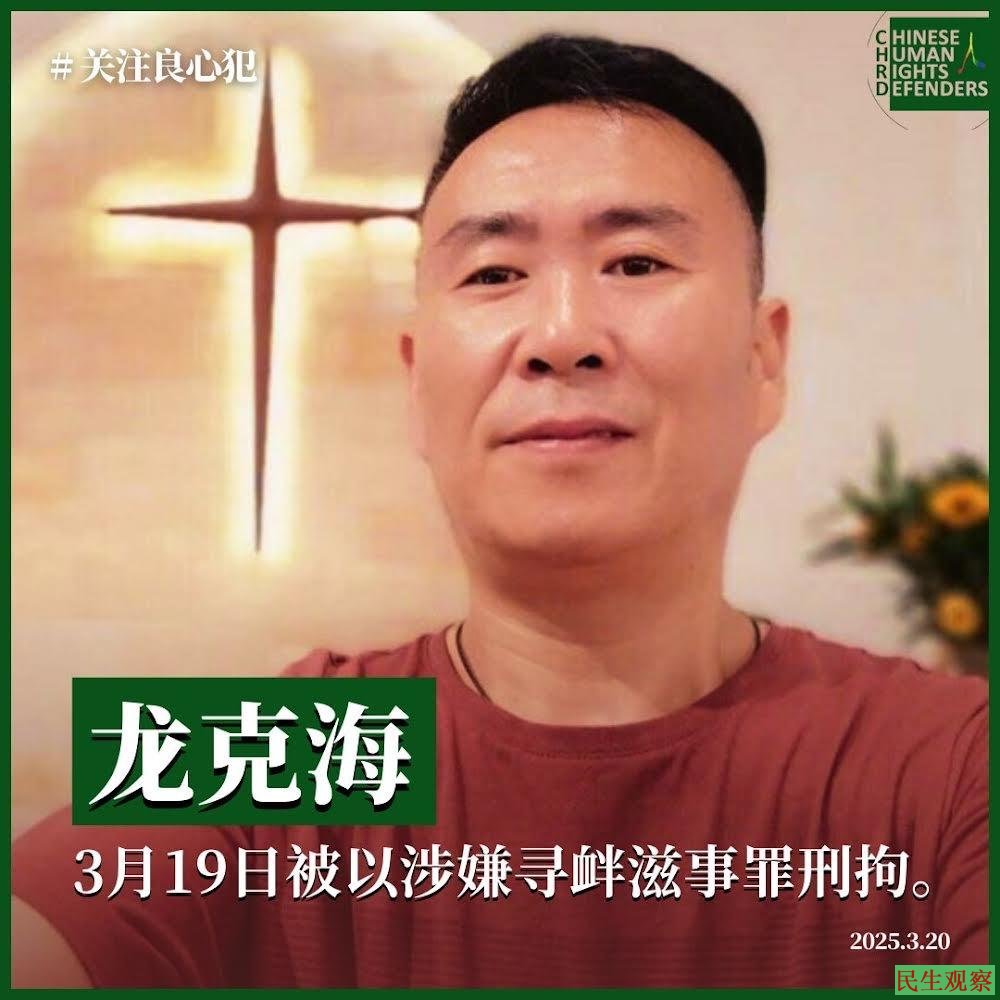 【民生观察2025年4月8日消息】2025年4月6日下午家属得知,龙克海于3月31日已被甘肃省徽县公检法机关批捕,罪名是寻衅滋事。据公开的消息称,龙克海先生在出狱后,立即加入秋雨圣约教会;在被抓捕之前,有去看守所探望张盼诚先生。