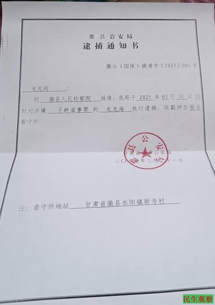 据拘留通知书显示,龙克海于2025年3月19日被甘肃省徽县公安局以涉嫌寻衅滋事罪刑拘;2025年3月31日被以涉嫌寻衅滋事罪执行逮捕,现羁押在甘肃省徽县看守所。