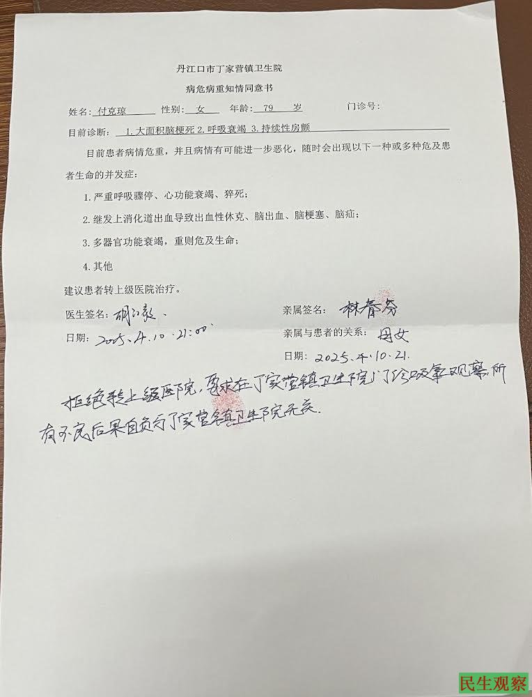 林春芬表示:“父亲在打不通我电话的情况下,放弃母亲在十堰市太和医院的治疗而回家。目前我母亲在丁家营镇卫生院住院进行保守治疗,恐有生命危险。”