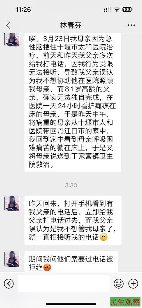 林春芬的母亲于2025年3月23日,因为急性脑梗住进十堰市太和医院治疗。在住院治疗期间,林春芬被十堰当局带走控制,手机被没收。