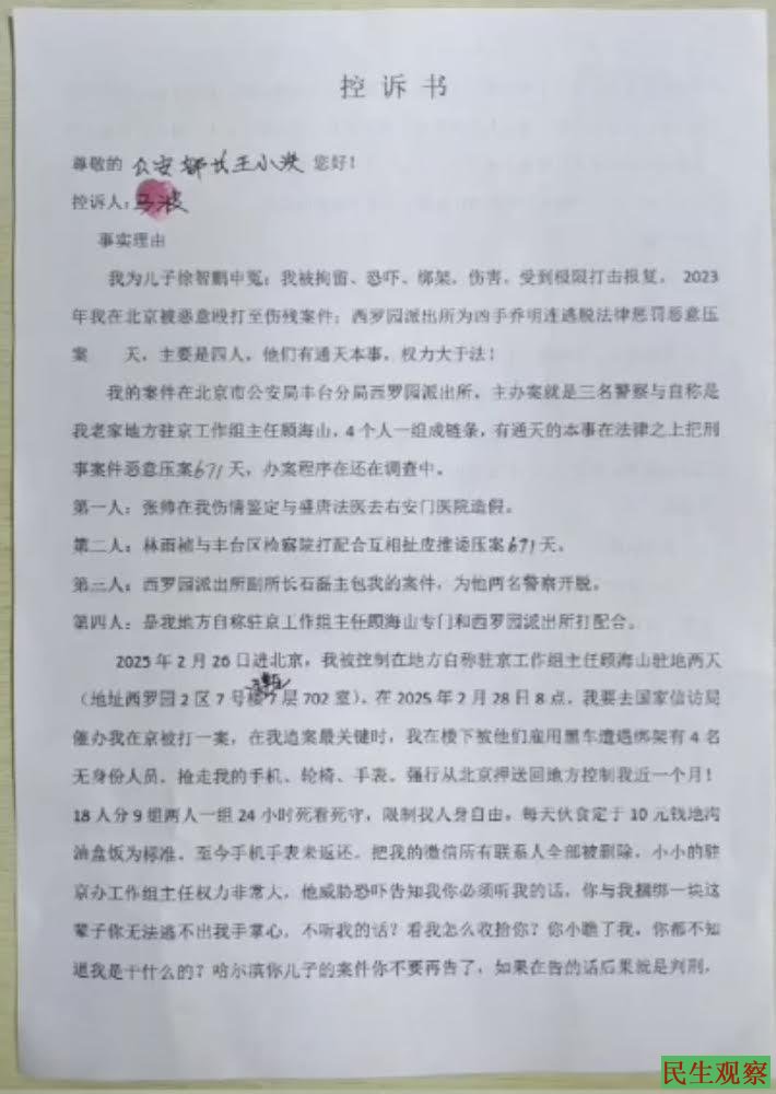 马波再次向西罗园派出所递交控诉材料