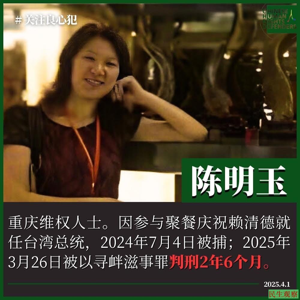 【民生观察2025年4月20日消息】重庆维权公民陈明玉被当局以寻衅滋事罪判刑两年半。近期律师前往会见了陈明玉,其身体和精神状况尚可。