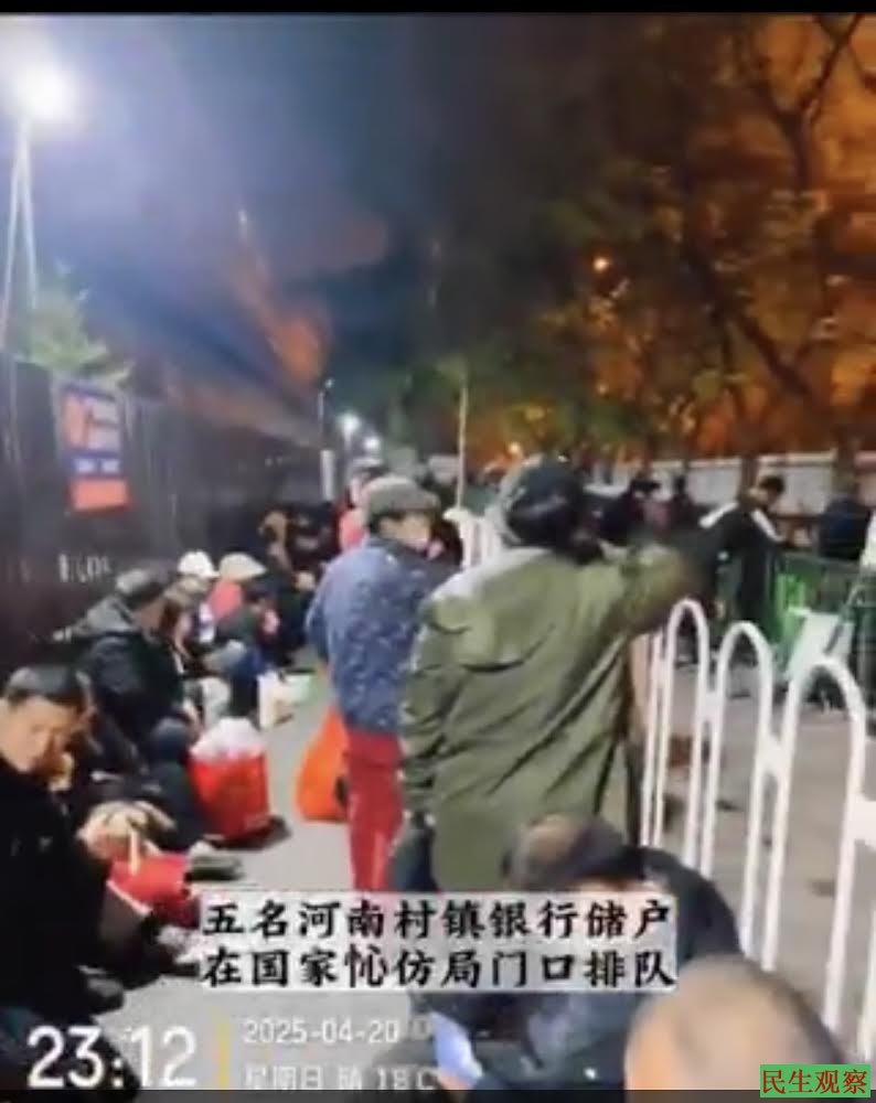 【民生观察2025年4月24日消息】2025年4月20日半夜,五名河南村镇银行储户和大量上访群众相互依偎在一起,在国家信访局门口排队,递交充满悲愤和绝望的投诉材料。长夜漫漫终于熬到天明,储户含泪现场赋诗:河南农商银行卡,只进不出像铁栏。当年存钱图个安,如今吃饭都犯难。储户含泪去信访,国家门口把话传。银行大门天天开,我们的钱却难回来。求求党和政府管,救救百姓血汗钱。莫让存款变泡沫,莫让信任化云烟。