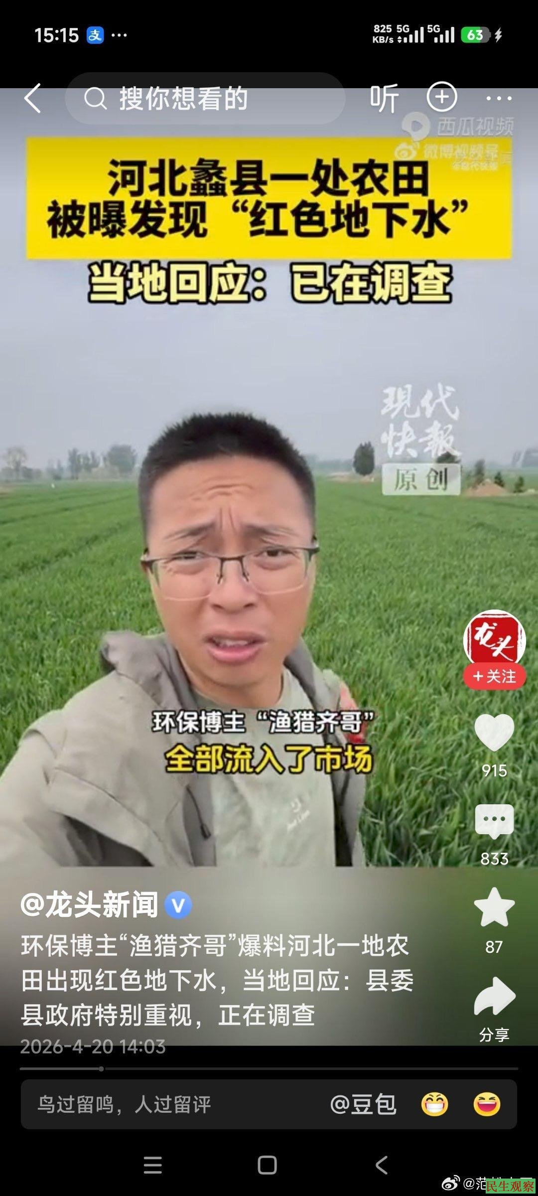 2026年4月19日,环保博主“渔猎齐哥”发布调查视频后,事件引发广泛关注。当地政府迅速响应,成立由生态环境、农业农村等部门组成的联合调查组,连夜对涉事区域17口灌溉井进行水样、土壤及小麦样本采集,并送省级和国家级权威机构检测。