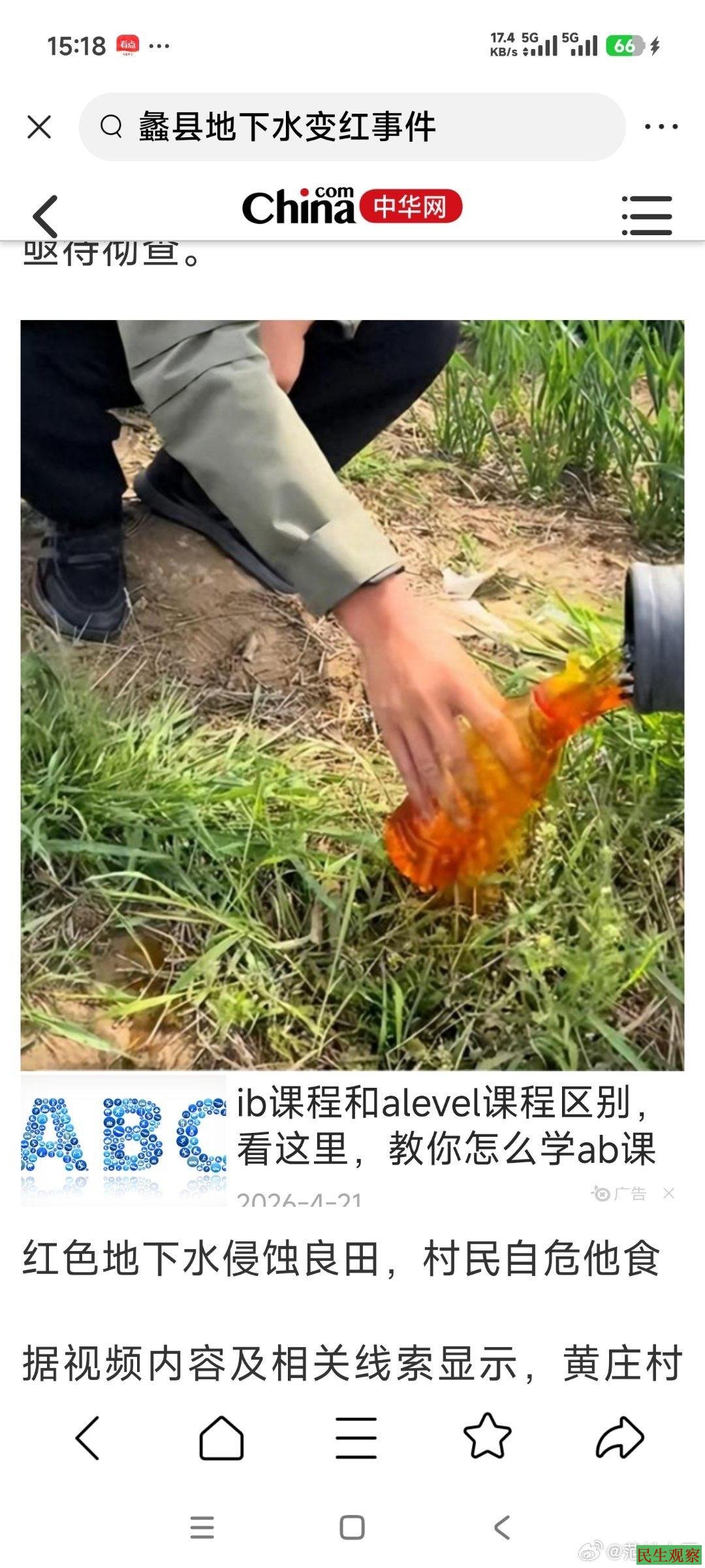 还有,居民用水咋办? 村民们反映这类泛红问题已持续多年,当地70米左右的浅层水井抽出来的水像冰红茶一样深红,但村民只能继续用这种水浇灌小麦,而小麦最终流向粮食市场。按规定,这类突发事件发生后,地方应立即启动应急供水、水源切换等措施。目前当地相关部门尚未公布调查结果,期待尽快查明真相。